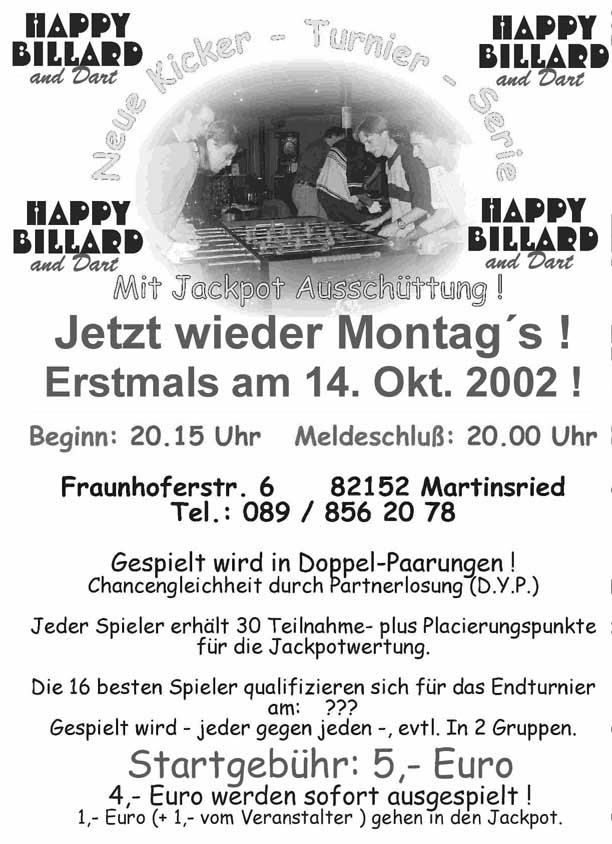 | 14.10. | Turnier im "Happy Billard" in München | |||